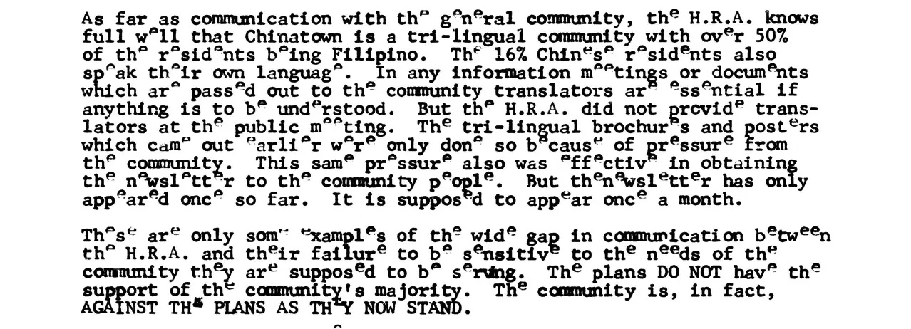 The San Francisco Chronicle writes, in July 1977, “the city finally agreed to pass a resolution to stop all Chinatown evictions; work out with PACE a low-cost housing and store-front plan...; and provide acceptable relocation in Chinatown.”